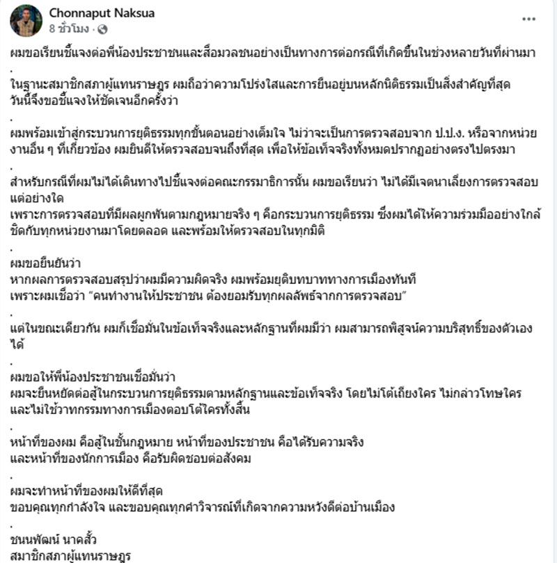 ผมขอยืนยันว่า หากผลการตรวจสอบสรุปว่าผมมีความผิดจริง ผมพร้อมยุติบทบาททางการเมืองทันที เพราะผมเชื่อว่า “คนทำงานให้ประชาชน ต้องยอมรับทุกผลลัพธ์จากการตรวจสอบ”