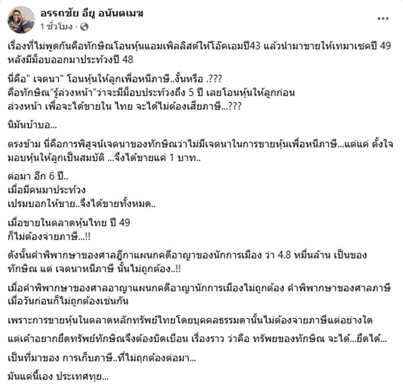 วันที่ 20 พฤศจิกายน 2568 นายอรรถชัย อนันตเมฆ สมาชิก พรรคเพื่อไทย อดีตดารานักแสดงและอดีตแนวร่วมคนเสื้อแดง โพสต์เฟซบุ๊ก ระบุว่า เรื่องที่ไม่พูดกันคือทักษิณโอนหุ้นแอมเพิลลิสต์ให้โอ๊คเอมปี43 แล้วนำมาขายให้เทมาเซคปี 49 หลังมีม็อบออกมาประท้วงปี 48
