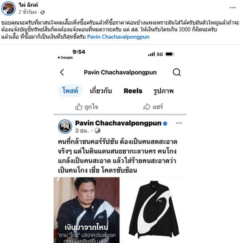 จากนั้น ศ.ดร.ปวิน ได้โพสต์สวนว่า “เสื้อฮู๊ดและกระเป๋า Dior รวม $9637 เท่ากับ 312,775 บาท ก่อนจะตรวจสอบจักรยานคนอื่น กรุณาอธิบายเอาเงินตรงนี้มาจากไหน ลำพังจะพูดว่าเป็นเงินบริสุทธิ์ ใครๆ ก็พูดได้ค่ะ ไผ่ ลิกค์”