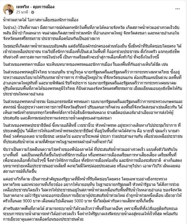 23 พฤศจิกายน 2568 นายเทพไท เสนพงศ์ อดีต สส.นครศรีธรรมราช โพสต์ข้อความผ่านเฟซบุ๊ก “เทพไท – คุยการเมือง” หัวข้อ “น้ำท่วมภาคใต้ โอกาสหาเสียงของนักการเมือง” ระบุว่า...