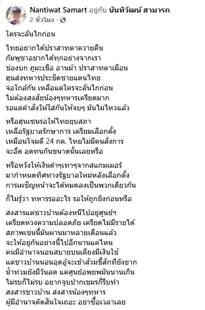 23 พฤศจิกายน 2568 นายนันทิวัฒน์ สามารถ อดีตรองผู้อำนวยการสำนักข่าวกรองแห่งชาติ โพสต์เฟซบุ๊ก Nantiwat Samart ระบุว่า...