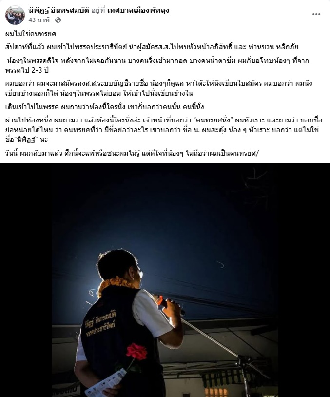 24 พฤศจิกายน 2568 นายนิพิฏฐ์ อินทรสมบัติ อดีต สส.พัทลุง พรรคประชาธิปัตย์ โพสต์ข้อความผ่านเฟซบุ๊ก ระบุว่า...