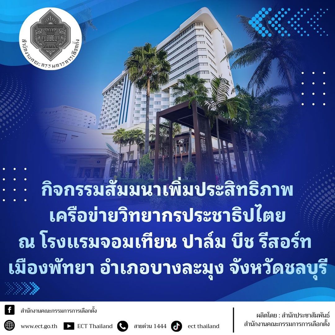 วันนี้ (24 พฤศจิกายน 2568) เวลา 09.00 น. นายวีระ ยี่แพร รองเลขาธิการคณะกรรมการการเลือกตั้ง (กกต.) เป็นประธานในพิธีเปิดกิจกรรมสัมมาเพิ่มประสิทธิภาพเครือข่ายวิทยากรประชาธิปไตย โดยมี นางสาวสุธิดา โชคพระสมบัติ ผู้อำนวยการสำนักพัฒนาเครือข่ายการเลือกตั้ง เป็นผู้กล่าวรายงาน ณ โรงแรมจอมเทียน ปาล์ม บีช รีสอร์ท เมืองพัทยา อำเภอบางละมุง จังหวัดชลบุรี