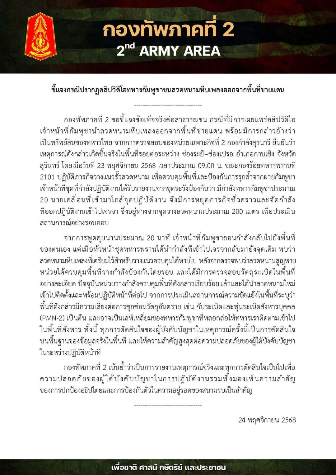 เมื่อวันที่ 24 พ.ย.2568 กองทัพภาคที่ 2 ได้ชี้แจงข้อเท็จจริงต่อสาธารณชน กรณีที่มีการเผยแพร่คลิปวิดีโอเจ้าหน้าที่กัมพูชานำลวดหนามหีบเพลงออกจากพื้นที่ชายแดน พร้อมมีการกล่าวอ้างว่าเป็นทรัพย์สินของทหารไทย จากการตรวจสอบของหน่วยเฉพาะกิจที่ 2 กองกำลังสุรนารี ยืนยันว่าเหตุการณ์ดังกล่าวเกิดขึ้นจริงในพื้นที่รอยต่อระหว่าง ช่องระยี–ช่องเปรอ อ.กาบเชิง จ.สุรินทร์