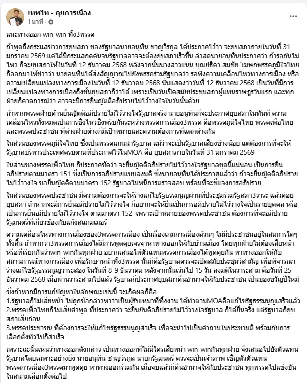 25 พฤศจิกายน 2568 นายเทพไท เสนพงศ์ อดีต สส.นครศรีธรรมราช โพสต์ข้อความผ่านเฟซบุ๊ก “เทพไท – คุยการเมือง” หัวข้อ “แนะทางออก win-win ทั้ง 3 พรรค” ระบุว่า...