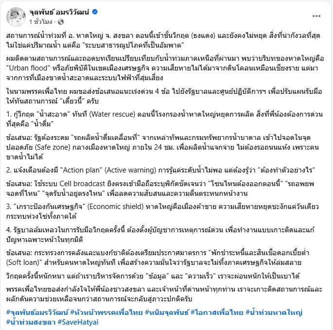 25 พฤศจิกายน 2568 นายจุลพันธ์ อมรวิวัฒน์ หัวหน้าพรรคเพื่อไทย (พท.) โพสต์ข้อความผ่านเฟซบุ๊ก ระบุว่า สถานการณ์น้ำท่วมที่ อ. หาดใหญ่ จ. สงขลา ตอนนี้เข้าขั้นวิกฤต (ธงแดง) และยังคงไม่หยุด สิ่งที่น่ากังวลที่สุดไม่ใช่แค่ปริมาณน้ำ แต่คือ “ระบบสาธารณูปโภคที่เป็นอัมพาต”