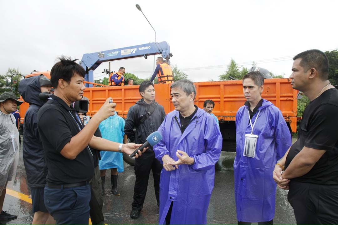 นายอภิสิทธิ์ ให้สัมภาษณ์ว่า ขณะนี้เชื่อว่ามีพี่น้องประชาชนติดอยู่ในพื้นที่ แม้จะได้รับแจ้งให้อพยพก็ไม่สามารถเดินทางออกมาได้ ขณะที่ในการลงพื้นที่ครั้งนี้ตนได้พบบรรดาอาสาสมัคร และหน่วยงานที่ระดมสรรพกำลังมา แต่ไม่สามารถเข้าดำเนินการช่วยเหลือได้ สิ่งที่สำคัญที่สุดในเวลานี้ รัฐบาลจำเป็นจะต้องจัดตั้งศูนย์กลางเพื่อให้พี่น้องประชาชน อาสาสมัคร สามารถเชื่อมต่อประสานกันได้ เพราะการสื่อสารในขณะนี้ก็เต็มไปด้วยความยากลำบาก จำเป็นที่จะต้องระดมความร่วมมือจากหลายหน่วยงาน เพื่อให้เกิดการสื่อสารอย่างเป็นระบบซึ่งจะเป็นหัวใจของการช่วยเหลือที่เกิดประสิทธิภาพที่สุด