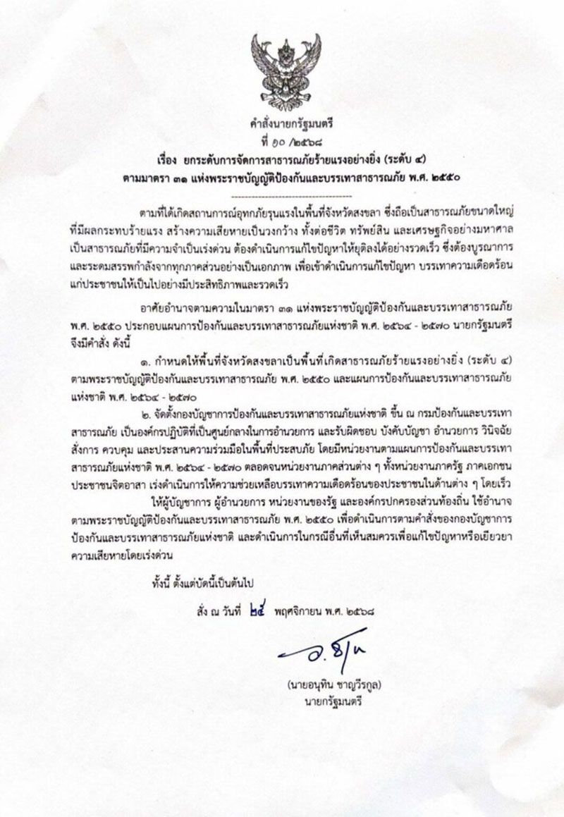 วันที่ 25 พฤศจิกายน 2568 นายอนุทิน ชาญวีรกูล นายกรัฐมนตรีและรัฐมนตรีว่าการกระทรวงมหาดไทย ประกาศยกระดับการจัดการสาธารณภัยร้ายแรงอย่างยิ่ง (ระดับ 4) ตามพระราชบัญญัติป้องกันและบรรเทาสาธารณภัย พ.ศ. 2550 โดยกำหนด "พื้นที่จังหวัดสงขลาเป็นพื้นที่เกิดสาธารณภัยร้ายแรงอย่างยิ่ง" เร่งบูรณาการทุกกลไกช่วยเหลือผู้ประสบอุทกภัย