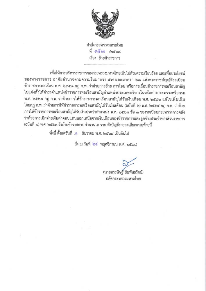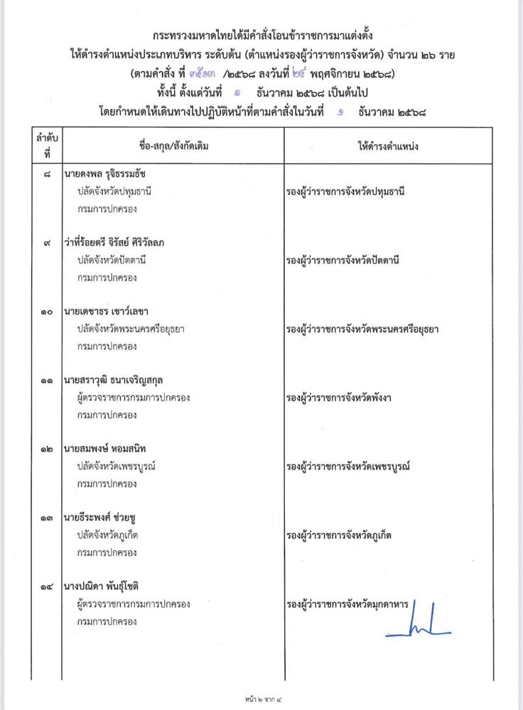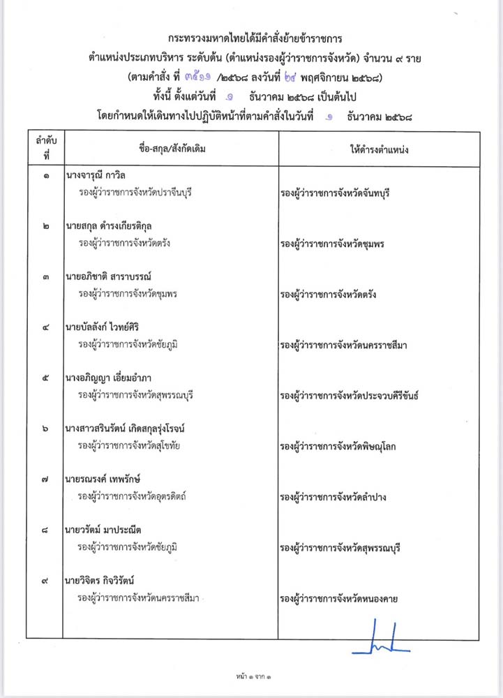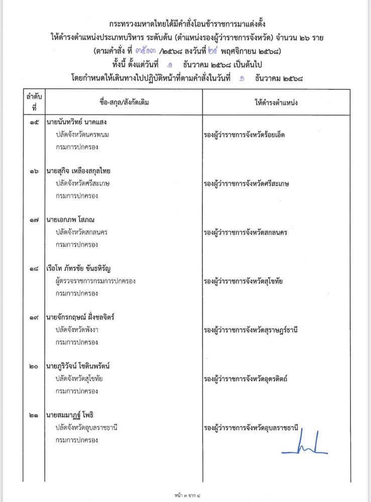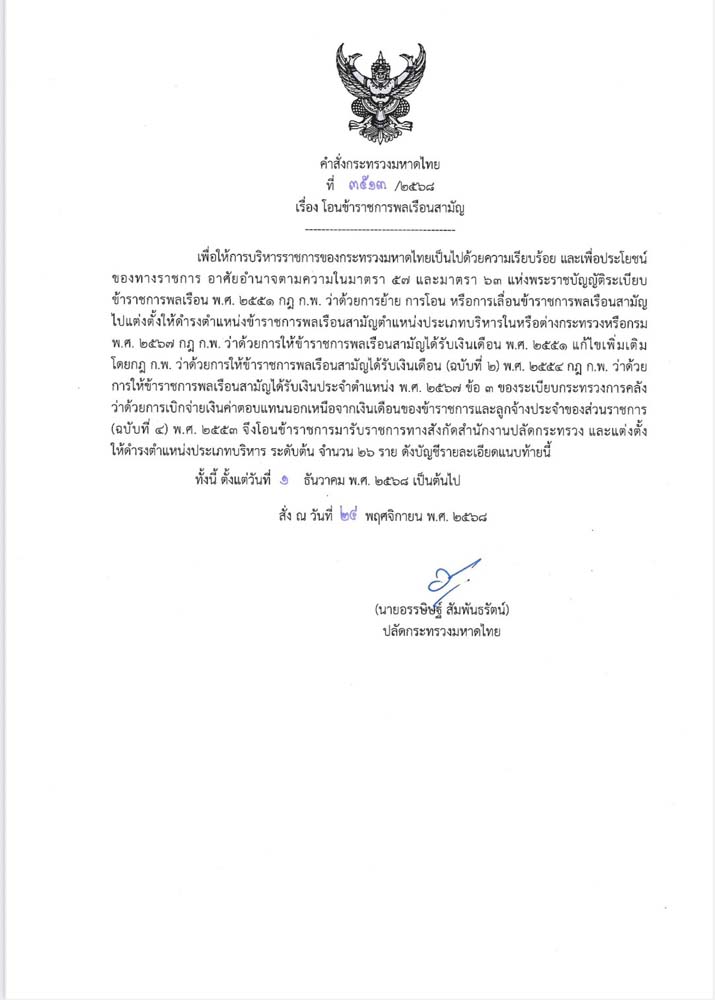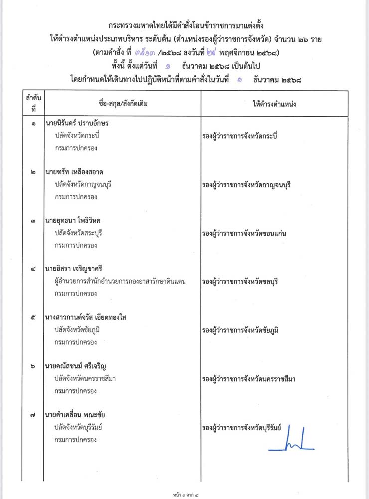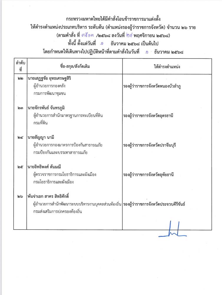 และ3.คำสั่งกระทรวงมหาดไทย ที่ 3513/2568 เรื่อง โอนข้าราชการพลเรือนสามัญ มาแต่งตั้งให้ดำรงตำแหน่งประเภทบริหาร ระดับต้น (ตำแหน่งรองผู้ว่าราชการจังหวัด) จำนวน 26 ราย ตั้งแต่วันที่ 1 ธ.ค.2568 เป็นต้นไป ตามคำสั่ง วันที่ 24 พ.ย.2568 ดังนี้