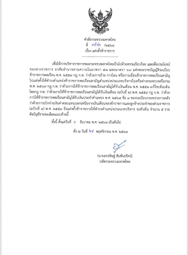 2.คำสั่งกระทรวงมหาดไทย ที่ 3512/2568 เรื่อง แต่งตั้งข้าราชการ ให้ดำรงตำแหน่งประเภทบริหาร ระดับต้น(ตำแหน่งรองผู้ว่าราชการจังหวัด) จำนวน 5 ราย ตั้งแต่วันที่ 1 ธ.ค.2568 เป็นต้นไป ตามคำสั่ง วันที่ 24 พ.ย. 2568 ดังนี้ 1.นายอนุชา อินทศร หัวหน้าสำนักงานจังหวัดนครราชสีมา ให้ดำรงตำแหน่ง รองผู้ว่าราชการจังหวัดชัยภูมิ2.นายชาคริต สุรณัฐกุล หัวหน้าสำนักงานคณะกรรมการมาตรฐานการบริหารหารงานบุคคลส่วนท้องถิ่น 5 ให้ดำรงตำแหน่ง รองผู้ว่าราชการจังหวัดนครศรีธรรมราช 3.นายชลิต ทิพย์คำ ผู้อำนวยการกองคลัง ให้ดำรงตำแหน่ง รองผู้ว่าราชการจังหวัดมุกดาหาร 4.นายปริญ นิทัศน์เอก ผู้อำนวยการศูนย์เทคโนโลยีสารสนเทศและการสื่อสาร ให้ดำรงตำแหน่ง รองผู้ว่าราชการจังหวัดสกลนคร 5.นายกล้าณรงค์ ยุติธรรม หัวหน้าสำนักงานจังหวัดสุราษฎร์ธานี ให้ดำรงตำแหน่ง รองผู้ว่าราชการจังหวัดสุราษฎร์ธานี