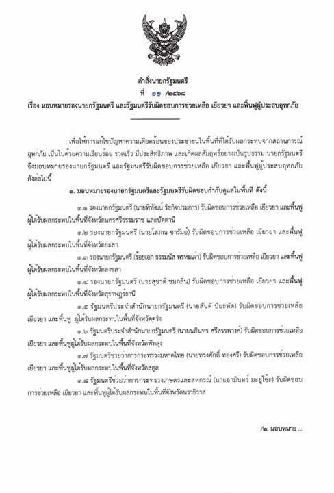 26 พฤศจิกายน 2568 นายอนุทิน ชาญวีรกูล นายกรัฐมนตรีและรมว.มหาดไทย ลงนามคำสั่งนายกรัฐมนตรีที่ 11/2568 เรื่อง มอบหมายรองนายกรัฐมนตรี และรัฐมนตรีรับผิดชอบการช่วยเหลือ เยียวยา และฟื้นฟูผู้ประสบอุทกภัยเพื่อให้การแก้ไขปัญหาความเดือดร้อนของประชาชนในพื้นที่ที่ได้รับผลกระทบจากสถานการณ์อุทกภัย เป็นไปด้วยความเรียบร้อย รวดเร็ว มีประสิทธิภาพ และเกิดผลสัมฤทธิ์อย่างเป็นรูปธรรม นายกรัฐมนตรี จึงมอบหมายรองนายกรัฐมนตรี และรัฐมนตรีรับผิดชอบการช่วยเหลือ เยียวยา และฟื้นฟูผู้ประสบอุทกภัยดังต่อไปนี้ ประกอบด้วย