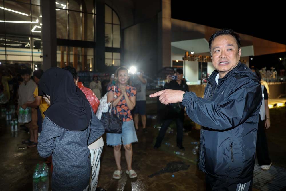 นายอนุทิน กล่าวว่า วันนี้ตนใช้เวลาทั้งวันลงพื้นที่ตามเส้นทางที่มีคนติดค้างอยู่ ซึ่งปัญหาความแรงของกระแสน้ำทำให้สิ่งที่จะเข้าไปช่วยเข้าไปไม่ถึงและเราได้เพิ่มเครื่องจักรที่มีกำลังต้านน้ำ อย่างที่อยู่ตอนนี้ที่มหาวิทยาลัยสงขลานครินทร์ ที่จัดให้เป็นศูนย์อพยพ ซึ่งตั้งไว้รองรับ 300- 500 คน แต่ตอนนี้มา 8,000 คนแล้ว ซึ่งการที่มหาวิทยาลัยช่วยดูแลประชาชนเป็นการแบ่งเบาภาระ และต้องขอชื่นชมศูนย์อพยพอื่นๆซึ่งมีหลายแห่ง ที่จะมีเรื่องอาหาร เรื่องการรักษาพยาบาลไว้พร้อม และทราบมาว่าเรื่องอาหารได้รับการบริจาคจำนวนมาก ต้องขอบคุณทุกท่านที่มีจิตคิดถึงเพื่อนร่วมชาติในยามยากเช่นนี้ และการที่ตนมาที่นี่ทั้งวัน เมื่อกลับไปจะเร่งหาแนวทางการช่วยเหลือเยียวยาให้ได้มากที่สุดเท่าที่จะทำได้ นี่เป็นเหตุที่ยิ่งกว่าภัยปกติ แต่เป็นภัยที่ร้ายแรงมากๆ