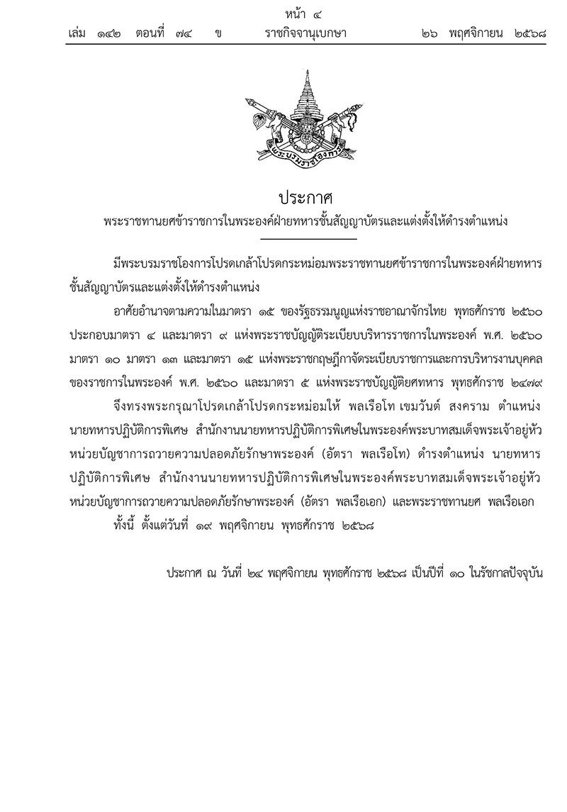 วันที่ 26 พฤศจิกายน 2568 เว็บไซต์ราชกิจจานุเบกษา เผยแพร่พระบรมราชโองการ ประกาศ พระราชทานยศข้าราชการในพระองค์ฝ่ายทหารชั้นสัญญาบัตรและแต่งตั้งให้ดำรงตำแหน่ง ความว่า