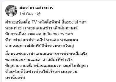 “สื่อมวลชนควรนำเสนอเฉพาะการช่วยเหลือจริง ของหน่วยงานและอาสาสมัครที่ทำจริง ปัญหาความเดือดร้อนและแนวทางแก้ไขปัญหา ที่จะช่วยชีวิตชาวบ้านได้จริงอย่างเร่งด่วน เท่านั้นครับ