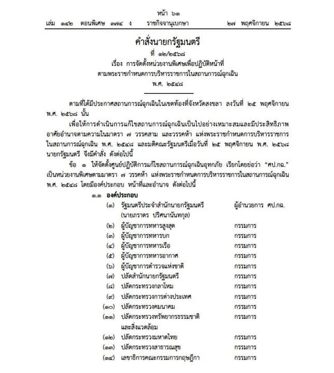 เมื่อวันที่ 28 พฤศจิกายน 2568 เว็บไซต์ราชกิจจานุเบกษา เผยแพร่คำสั่งนายกรัฐมนตรี ที่ 12/2568 เรื่อง การจัดตั้งหน่วยงานพิเศษเพื่อปฏิบัติหน้าที่ตามพระราชกำหนดการบริหารราชการในสถานการณ์ฉุกเฉิน พ.ศ.2548 ระบุว่า ตามที่ได้มีประกาศสถานการณ์ฉุกเฉินในเขตท้องที่ จังหวัดสงขลา ลงวันที่ 25 พฤศจิกายน พ.ศ.2568 นั้น เพื่อให้การดำเนินการแก้ไขสถานการณ์ฉุกเฉินเป็นไปอย่างเหมาะสมและมีประสิทธิภาพ อาศัยอำนาจตามความในมาตรา 7 วรรคสาม และวรรคห้า แห่งพระราชกำหนดการบริหารราชการในสถานการณ์ฉุกเฉิน พ.ศ.2548 และมติคณะรัฐมนตรีเมื่อวันที่ 25 พฤศจิกายน พ.ศ.2568 นายกรัฐมนตรี จึงมีคำสั่ง ดังต่อไปนี้