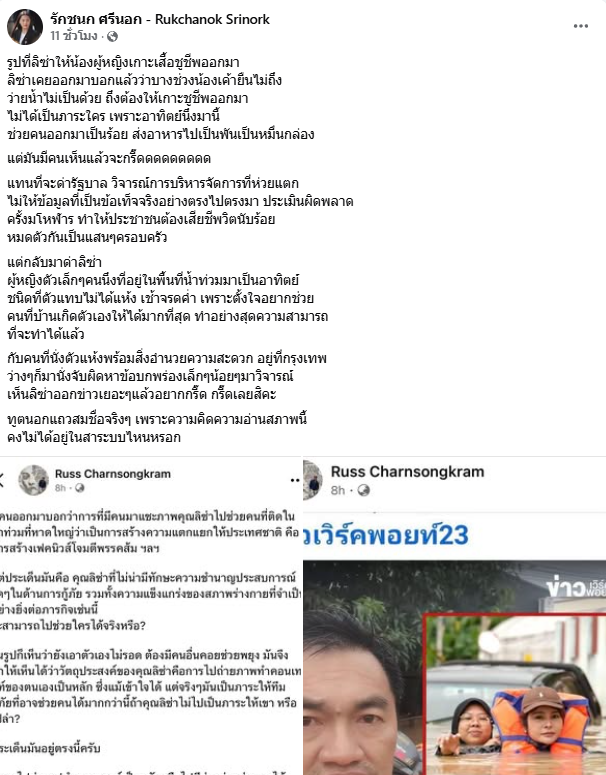 นางสาวรักชนก ระบุว่า ขณะลิซ่าอยู่กลางน้ำท่วมจนตัวแทบไม่แห้งตลอดทั้งสัปดาห์ กลับมีคนที่นั่งอยู่สบายในกรุงเทพฯ มาคอยจับผิดรายละเอียดเล็กน้อย พร้อมทิ้งท้ายว่า "เห็นลิซ่าออกข่าวเยอะๆ แล้วอยากกรี๊ด กรี๊ดเลยสิคะ"