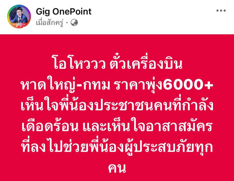 “ณณัฏฐ์”โวยตั๋วเครื่องบินหาดใหญ่-กทม.สุดแพง เที่ยวละ 6,000 บาท เห็นใจประชาชน-กู้ภัยเดือดร้อน