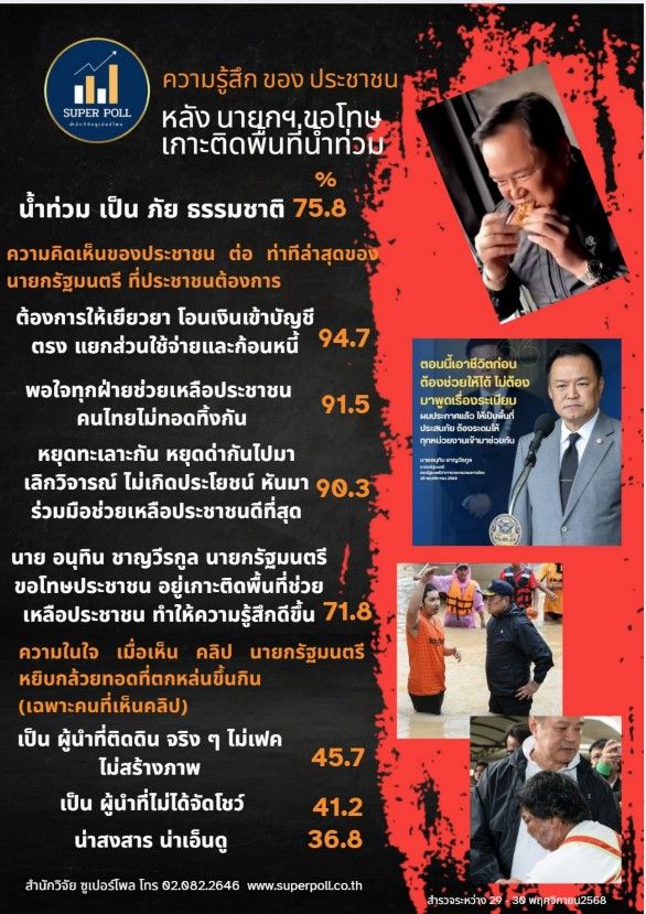 เมื่อวันที่ 30 พ.ย.2568 สำนักวิจัยซูเปอร์โพลได้ดำเนินการสำรวจความคิดเห็นประชาชนทุกสาขาอาชีพทั่วประเทศ เพื่อศึกษาความรู้สึก ความต้องการ และมุมมองของประชาชนต่อเหตุการณ์มหาอุทกภัยภาคใต้ รวมถึงท่าทีของนายกรัฐมนตรี นายอนุทิน ชาญวีรกูล ที่ได้ออกมาขอโทษประชาชน ยอมรับความบกพร่อง และลงพื้นที่ให้ความช่วยเหลือด้วยตัวเองอย่างต่อเนื่อง ผลสำรวจนี้สะท้อนภาพรวมของ “ความรู้สึกใหม่” หลังเหตุการณ์น้ำท่วมใหญ่ ซึ่งเป็นทั้งวิกฤตของภัยธรรมชาติ และบททดสอบสำคัญของรัฐบาลชุดปัจจุบัน