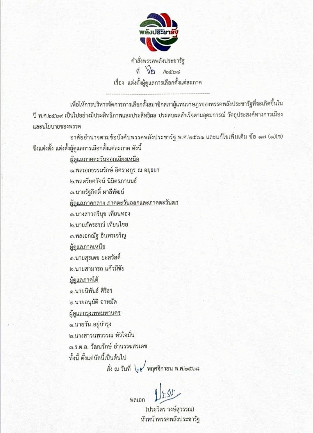เมื่อวันที่ 30 พฤศจิกายน 2568 ผู้สื่อข่าวรายงานจากพรรคพลังประชารัฐ (พปชร.) ว่า พล.อ.ประวิตร วงษ์สุวรรณ หัวหน้าพรรคพลังประชารัฐ ลงนามคำสั่งพรรค พปชร.ที่ 62/2568 เรื่อง แต่งตั้งผู้ดูแลการเลือกตั้งแต่ละภาค เพื่อให้การบริหารจัดการการเลือกตั้งสมาชิกสภาผู้แทนราษฎรของพรรคพลังประชารัฐที่จะเกิดขึ้นในปี พ.ศ.2569 เป็นไปอย่างมีประสิทธิภาพและประสิทธิผล ประสบผลสำเร็จตามอุดมการณ์ วัตถุประสงค์ทางการเมืองและนโยบายของพรรค
