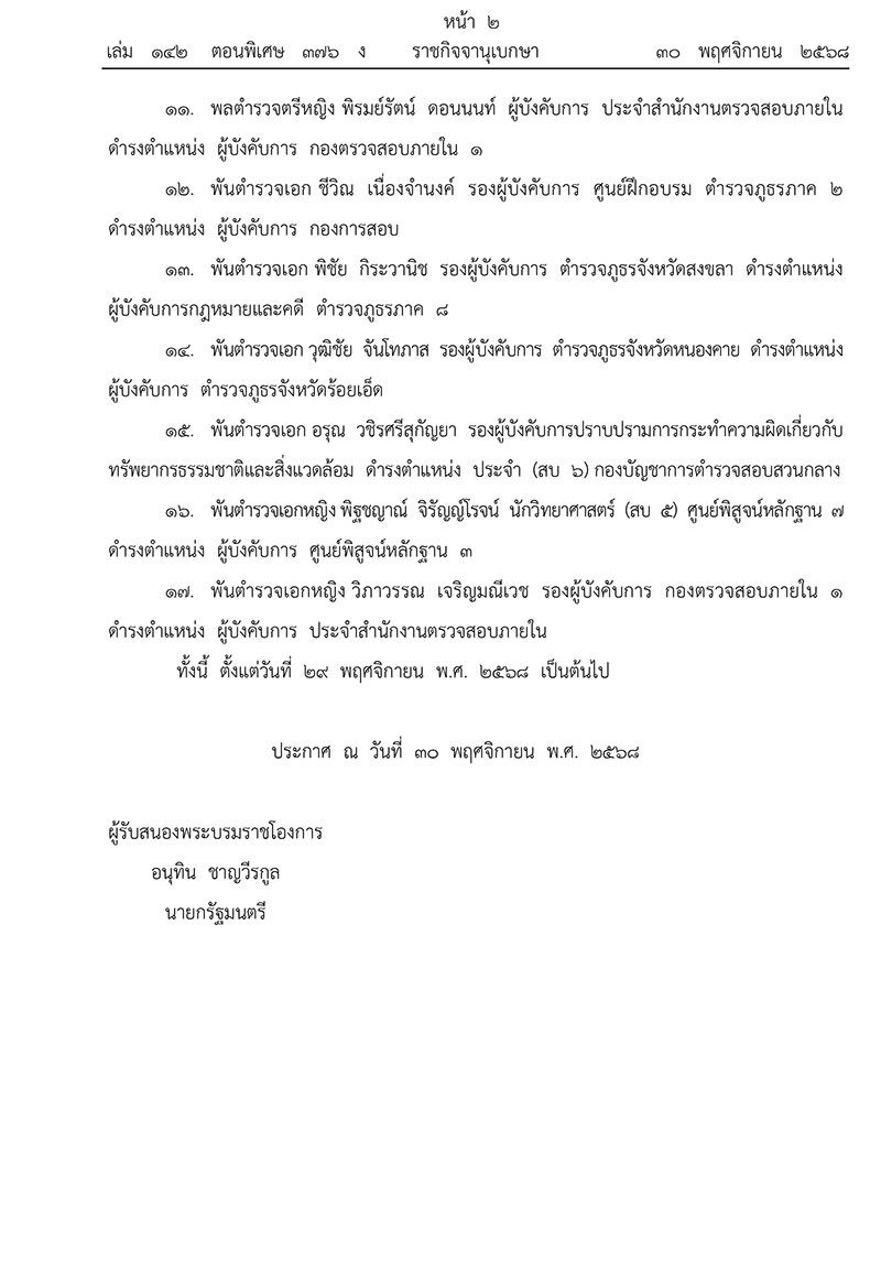 มีพระบรมราชโองการโปรดเกล้าโปรดกระหม่อมแต่งตั้งข้าราชการตำรวจ ให้ดำรงตำแหน่งต่างๆ จำนวน 17 รายดังนี้