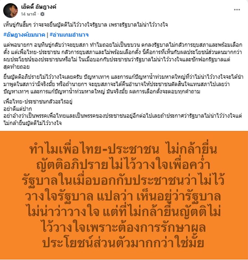 วันที่ 2 ธันวาคม 2568 นายอัษฎางค์ ยมนาค หรือ “เอ็ดดี้” นักวิชาการอิสระ โพสต์เฟซบุ๊ก ระบุว่า เห็นขู่กันฮึ่มๆ ว่าจะจะยื่นญัตติไม่ไว้วางใจรัฐบาล เพราะรัฐบาลไม่น่าไว้วางใจ