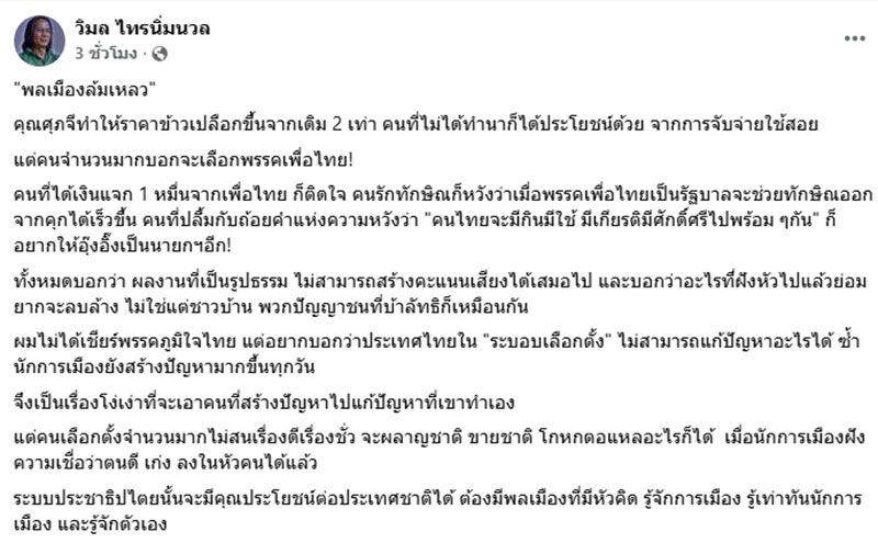 วันที่ 2 ธันวาคม 2568 วิมล ไทรนิ่มนวล นักเขียนรางวัลซีไรต์ โพสต์ข้อความผ่านเฟซบุ๊ก ระบุว่า "พลเมืองล้มเหลว"