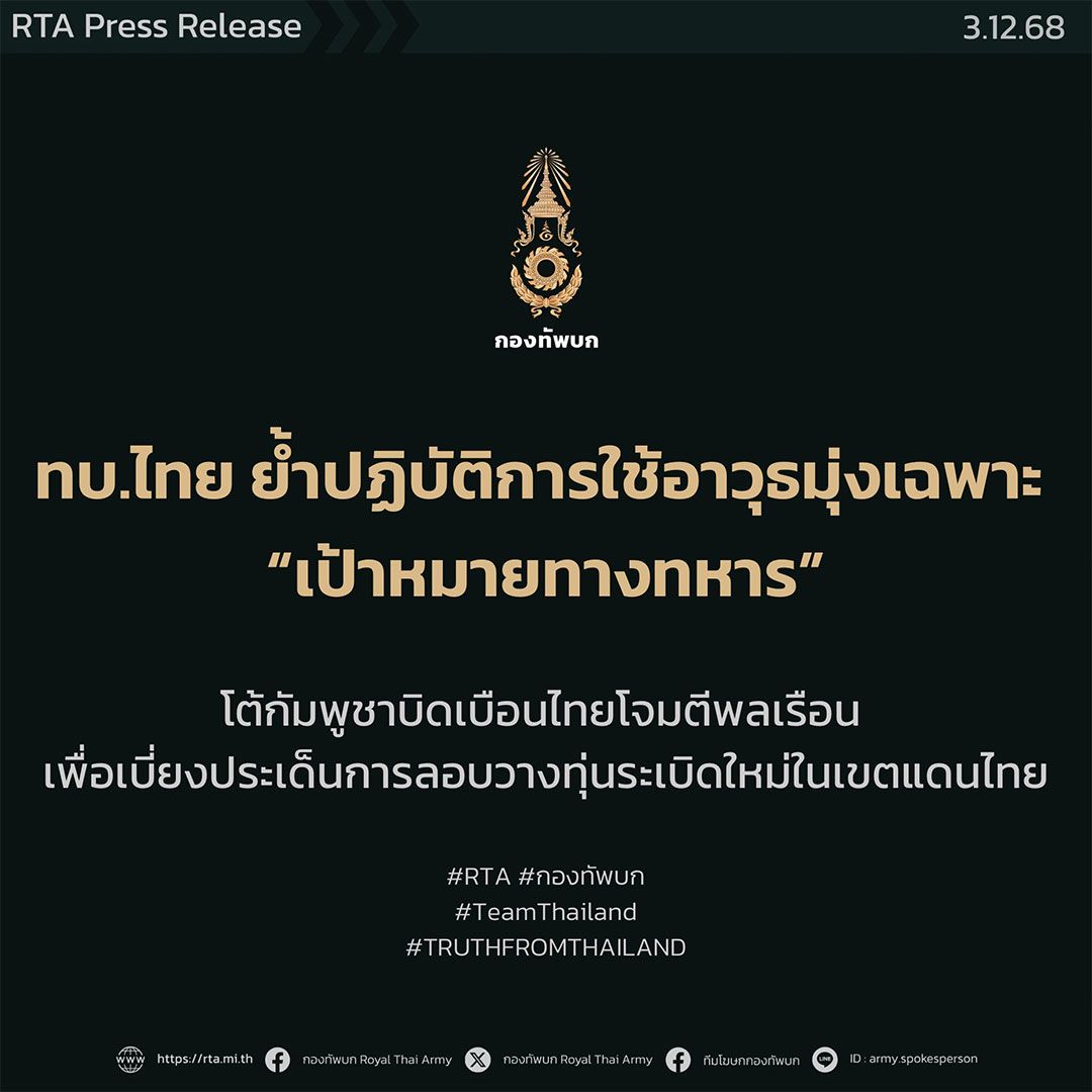 ทบ.ไทยย้ำปฏิบัติการใช้อาวุธมุ่งเฉพาะ “เป้าหมายทางทหาร” ตามหลักมนุษยธรรมสากล โต้กัมพูชาบิดเบือนไทยโจมตีพลเรือน เพื่อเบี่ยงประเด็นจากข้อกล่าวหาลอบวางทุ่นระเบิดใหม่ในเขตแดนไทย