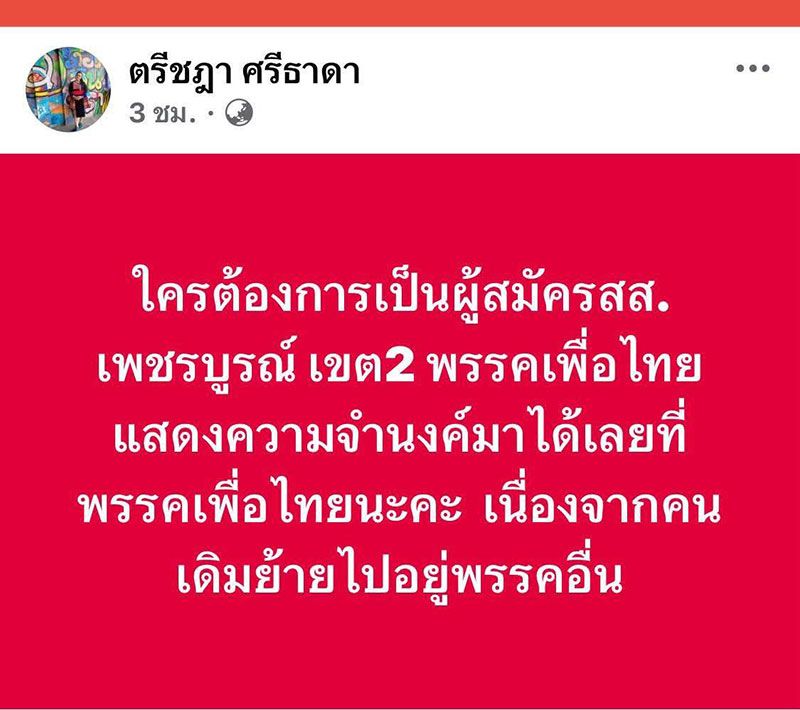 วันที่ 4 ธันวาคม 2568 น.ส.ตรีชฎา ศรีธาดา อดีตโฆษกกระทรวงสาธารณสุขฝ่ายการเมือง และ แกนนำครอบครัวเพื่อไทย (พท.) โพสต์ข้อความผ่านเฟซบุ๊กส่วนตัว ระบุว่า ใครต้องการเป็นผู้สมัครสส. เพชรบูรณ์ เขต2 พรรคเพื่อไทย แสดงความจำนงค์มาได้เลยที่พรรคเพื่อไทยนะคะ เนื่องจากคนเดิมย้ายไปอยู่พรรคอื่น