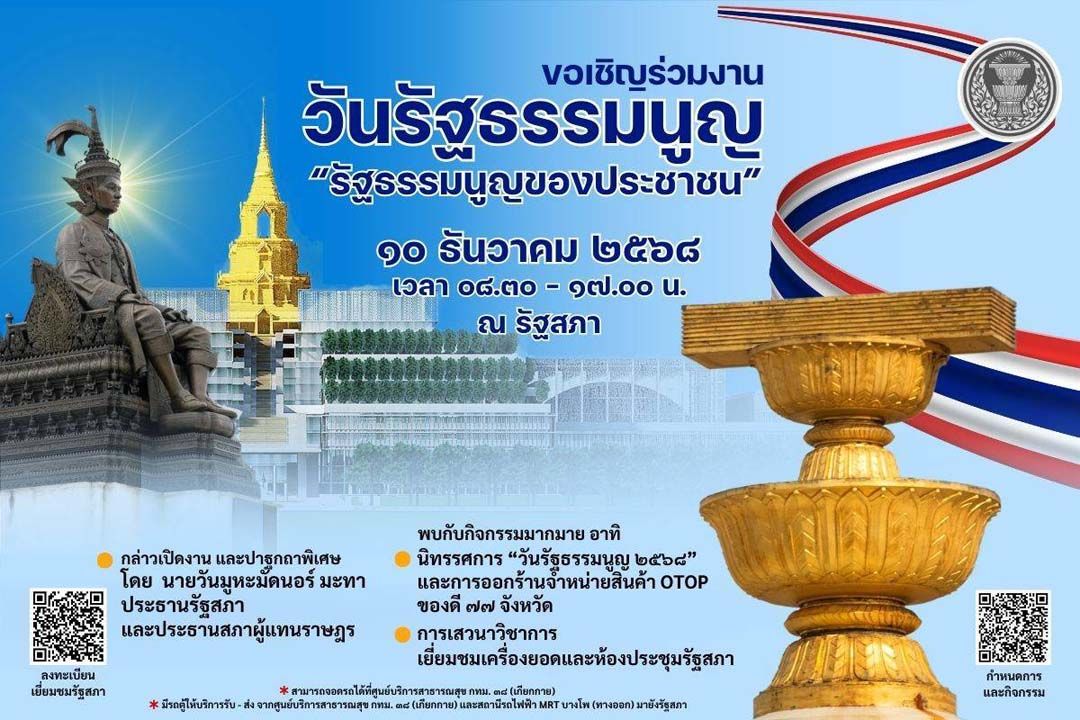 เมื่อวันที่ 4 ธันวาคม 2568 ที่รัฐสภา นายศิโรจน์ แพทย์พันธุ์ เลขาธิการสภาผู้แทนราษฎร แถลงถึงกรณีการจัดงานวันรัฐธรรมนูญประจำปี 2568 ว่า สํานักงานเลขาธิการสภาผู้แทนราษฎร โดยคณะกรรมการจัดงานวันรัฐธรรมนูญประจําปี 2568 จะมีการจัดงานวันรัฐธรรมนูญประจําปี 2568 ในวันที่ 10 ธันวาคม ตั้งแต่เวลา 08.30 - 17.00 น.ที่อาคารรัฐสภา โดยมีวัตถุประสงค์เพื่อเป็นการส่งเสริมการมีส่วนร่วมของประชาชน ในทุกภาคส่วน และเสริมสร้างความรู้ความเข้าใจเกี่ยวกับการปกครองในระบอบประชาธิปไตยและบทบาท ภารกิจของสภาผู้แทนราษฎร รวมทั้งเพื่อเป็นการรื้อฟื้นกิจกรรมที่สําคัญในอดีตและให้ความสําคัญกับรัฐธรรมนูญ ซึ่งเป็นกฎหมายสูงสุด