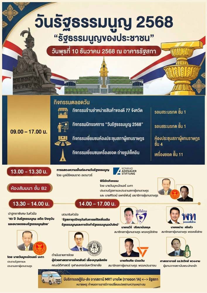 นายศิโรจน์ กล่าวอีกว่า อีกทั้ง ยังมีการจัดแสดงนิทรรศการวันรัฐธรรมนญ 2568 และการออกร้านจําหน่ายสินค้า OTOP ของดี 77 จังหวัด บริเวณรอบสระมรกต ชั้น 1 อาคารรัฐสภา ตั้งแต่วันที่ 8-10 ธันวาคม โดยผู้เข้าร่วมงานสามารถนํารถมาจอดได้ที่ศูนย์บริการสาธารณสุข กทม. 38 (เกียกกาย) ซึ่งสํานักงานฯ ได้จัดรถตู้ให้บริการรับ-ส่ง มายังรัฐสภา ในวันที่ 10 ธันวาคม พร้อมรถตู้ให้บริการ รับส่งจากรถไฟฟ้า MRT สถานีบางโพ มายังรัฐสภาอีกด้วย