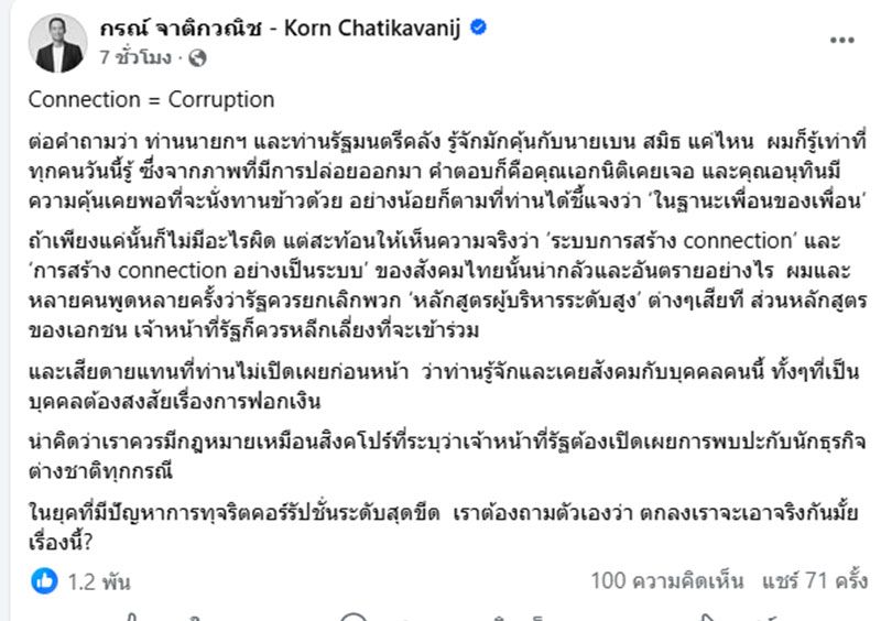 ถ้าเพียงแค่นั้นก็ไม่มีอะไรผิด แต่สะท้อนให้เห็นความจริงว่า ’ระบบการสร้าง connection’ และ ‘การสร้าง connection อย่างเป็นระบบ’ ของสังคมไทยนั้นน่ากลัวและอันตรายอย่างไร ผมและหลายคนพูดหลายครั้งว่ารัฐควรยกเลิกพวก ‘หลักสูตรผู้บริหารระดับสูง’ ต่างๆเสียที ส่วนหลักสูตรของเอกชน เจ้าหน้าที่รัฐก็ควรหลีกเลี่ยงที่จะเข้าร่วม