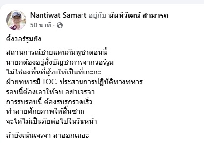 8 ธันวาคม 2568 นายนันทิวัฒน์ สามารถ อดีตเลขานุการรัฐมนตรีว่าการกระทรวงการต่างประเทศ และอดีตรองผู้อำนวยการสำนักข่าวกรองแห่งชาติ โพสต์ข้อความผ่านเฟซบุ๊ก Nantiwat Samart ระบุว่า “ตั้งวอร์รูมยัง สถานการณ์ชายแดนกัมพูชาตอนนี้ นายกต้องอยู่สั่งบัญชาการจากวอร์รูม ไม่ใช่ลงพื้นที่สู้รบให้เป็นที่เกะกะ”