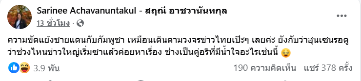 ข้อความดังกล่าวระบุว่า "ความขัดแย้งชายแดนกับกัมพูชา เหมือนเดินตามวงจรข่าวไทยเป๊ะๆ เลยค่ะ ยังกับว่าฮุนเซนรอดูว่าช่วงไหนข่าวใหญ่เริ่มซาแล้วค่อยหาเรื่อง ช่างเป็นคู่อริที่มีน้ำใจอะไรเช่นนี้"