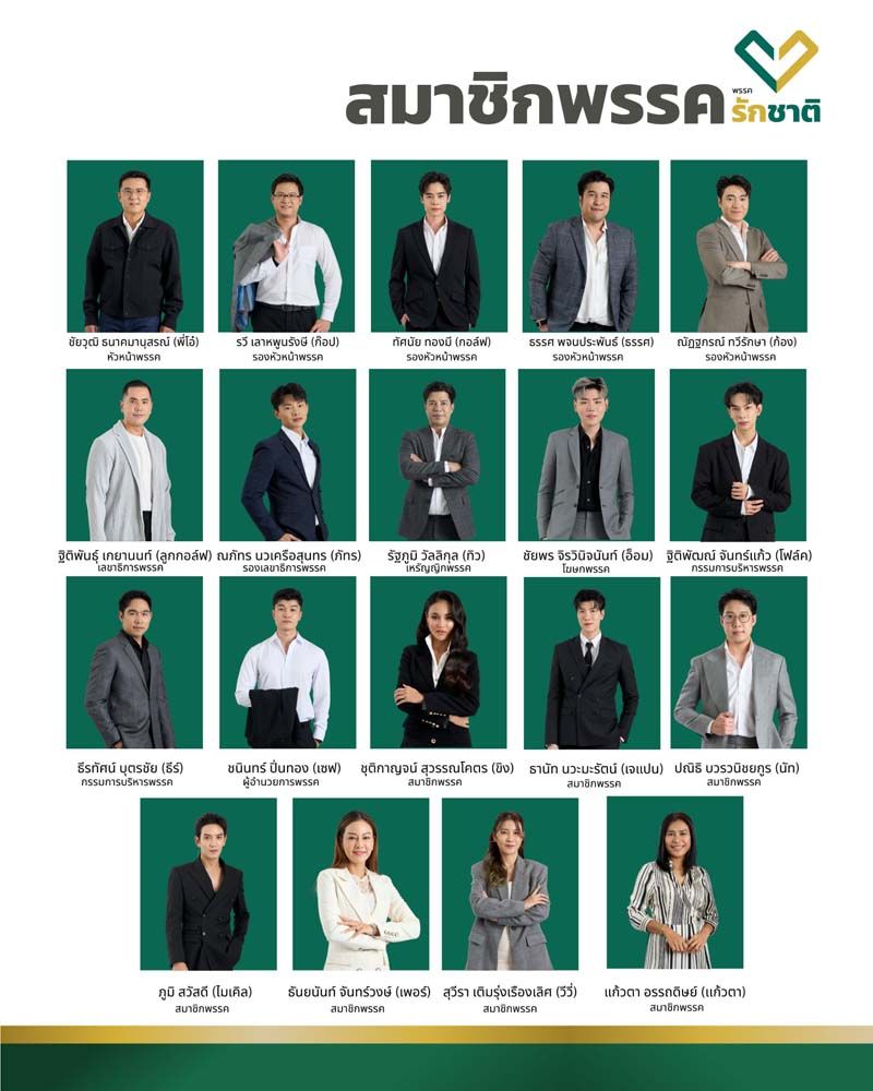 สำหรับกรรมการบริหารพรรครักชาติ จำนวน 23 คน ประกอบด้วย 1.นายชัยวุฒิ ธนาคมานุสรณ์ หัวหน้าพรรค 2.นายรวี เลาหพูนรังษี รองหัวหน้าพรรค 3.นายทัศนัย ทองมี รองหัวหน้าพรรค 4.นายธรรศ พจนประพันธ์ รองหัวหน้าพรรค 5.นายณัฏฐกรณ์ ทวีรักษา รองหัวหน้าพรรค 6.นายฐิติพันธุ์ เกยานนท์ เลขาธิการพรรค 7.นายณภัทร นวเครือสุนทร รองเลขาธิการพรรค 8.นายรัฐภูมิ วัลลิกุล เหรัญญิกพรรค 9.นายอดัม ชินรัตนพิสิทธิ์ ผู้ช่วยเหรัญญิกพรรค 10.น.ส.นวลกนก คชนันทน์ นายทะเบียนสมาชิกพรรค