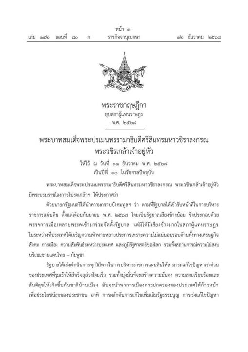 12 ธันวาคม 2568 เว็บไซต์ ราชกิจจานุเบกษา เผยแพร่พระราชกฤษฎีกายุบสภา พ.ศ.2568 ระบุว่าพระบาทสมเด็จพระปรเมนทรรามาธิบดีศรีสินทรมหาวชิราลงกรณ พระวชิรเกล้าเจ้าอยู่หัว มีพระบรมราชโองการโปรดเกล้าฯ ให้ประกาศว่าด้วยนายกรัฐมนตรีได้นำความกราบบังคมทูลฯ สมควรยุบสภาผู้แทนราษฎร เพื่อจัดให้มีการเลือกตั้งสมาชิกสภาผู้แทนราษฎรใหม่เป็นการเลือกตั้งทั่วไป