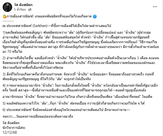 12 ธันวาคม 2568 นายวัส ติงสมิตร นักวิชาการอิสระ อดีตผู้พิพากษาอาวุโสในศาลฎีกา และอดีตประธานกรรมการสิทธิมนุษยชนแห่งชาติ (กสม.) โพสต์เฟซบุ๊กหัวข้อ “การเมืองสารขัณฑ์: เกมแห่งพันธมิตรที่จบลงไม่ไกลเกินคาด” ระบุว่า...