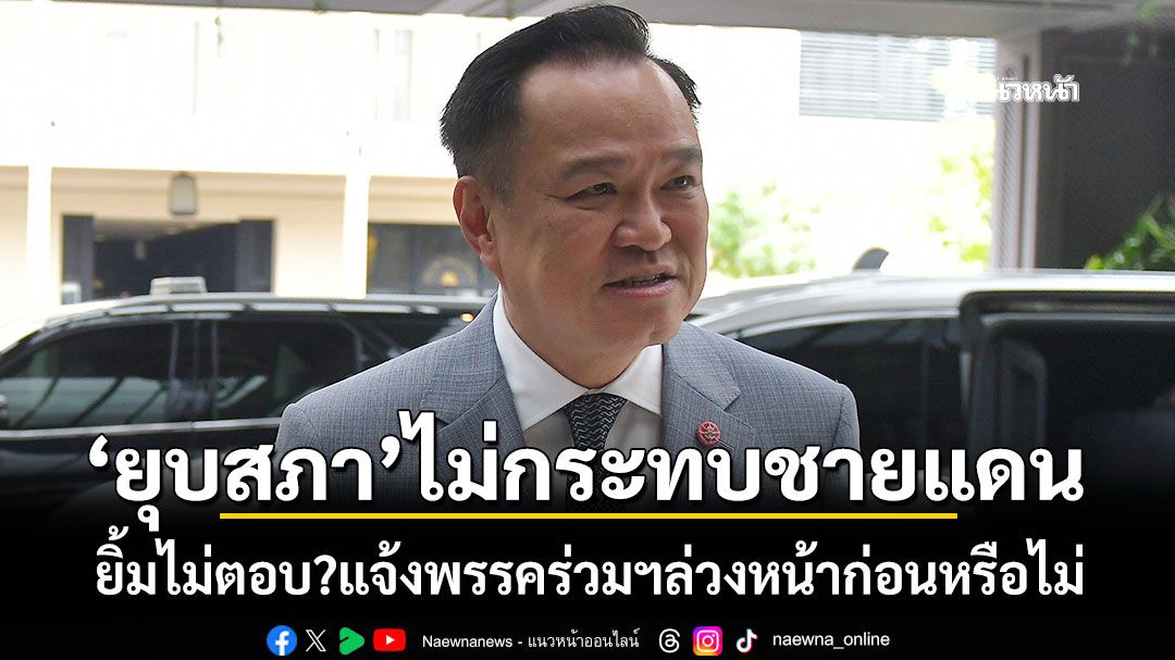 เมื่อเวลา 08.27 น.วันที่ 12 ธันวาคม 2568 ที่ทำเนียบรัฐบาล นายอนุทิน ชาญวีรกูล นายกรัฐมนตรี และรมว.มหาดไทย ตอบคำถามสื่อถึงกรณีที่มีการยุบสภา จะแถลงเหตุผลในการยุบสภา ผ่านโทรทัศน์รวมการเฉพาะกิจ หรือไม่ ซึ่งนายกฯ กล่าวสั้นๆ ว่า "ยังไม่มี" เมื่อถามว่า ได้แจ้งพรรคร่วมรัฐบาลล่วงหน้าก่อนยุบสภาหรือไม่ นายกฯ ยิ้ม แต่ไม่ตอบคำถาม ผู้สื่อข่าวถามอีกว่า การยุบสภาจะกระทบต่อสถานการณ์ชายแดนไทย-กัมพูชา หรือไม่ นายกฯ กล่าวว่า "ไม่กระทบครับ"