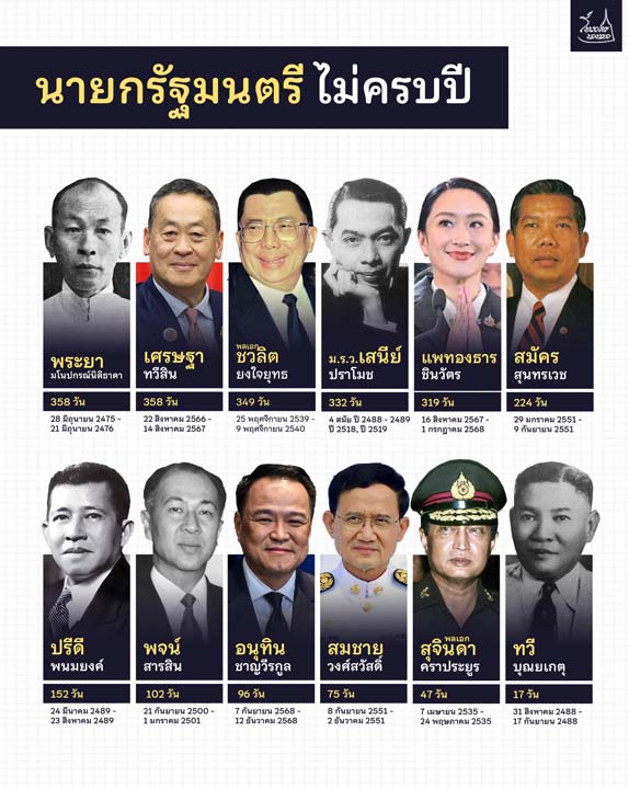 12 ธันวาคม 2568 ภายหลังนายอนุทิน ชาญวีรกูล นายกรัฐมนตรี และรมว.มหาดไทย ประกาศ “ยุบสภา” ทำให้ “รัฐบาลนายอนุทิน” อยู่ในวาระไม่ถึงขวบปี ซึ่งไม่ใช่ครั้งแรก เพราะก่อนหน้านี้เคยมีรัฐบาลที่อยู่ในวาระไม่ถึงปีเช่นกัน โดยเพจเฟซบุ๊ก “โบราณนานมา” ได้ทำการรวบรวมไว้ ดังนี้...