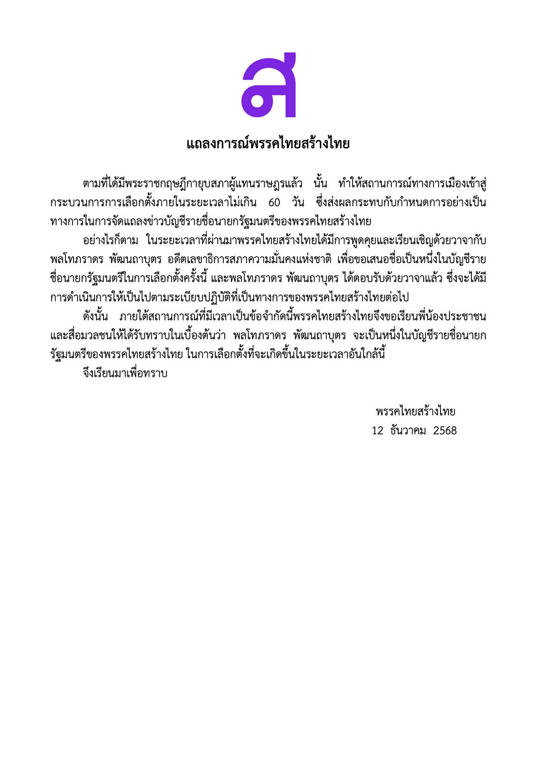 เมื่อวันที่ 12 ธันวาคม 2568 พรรคไทยสร้างไทย (ทสท.) ออกแถลงการณ์ ระบุว่า ตามที่ได้มีพระราชกฤษฎีกายุบสภาผู้แทนราษฎรแล้ว นั้น ทำให้สถานการณ์ทางการเมืองเข้าสู่กระบวนการการเลือกตั้งภายในระยะเวลาไม่เกิน 60 วัน ซึ่งส่งผลกระทบกับกำหนดการอย่างเป็นทางการในการจัดแถลงข่าวบัญชีรายชื่อนายกรัฐมนตรีของพรรคไทยสร้างไทย