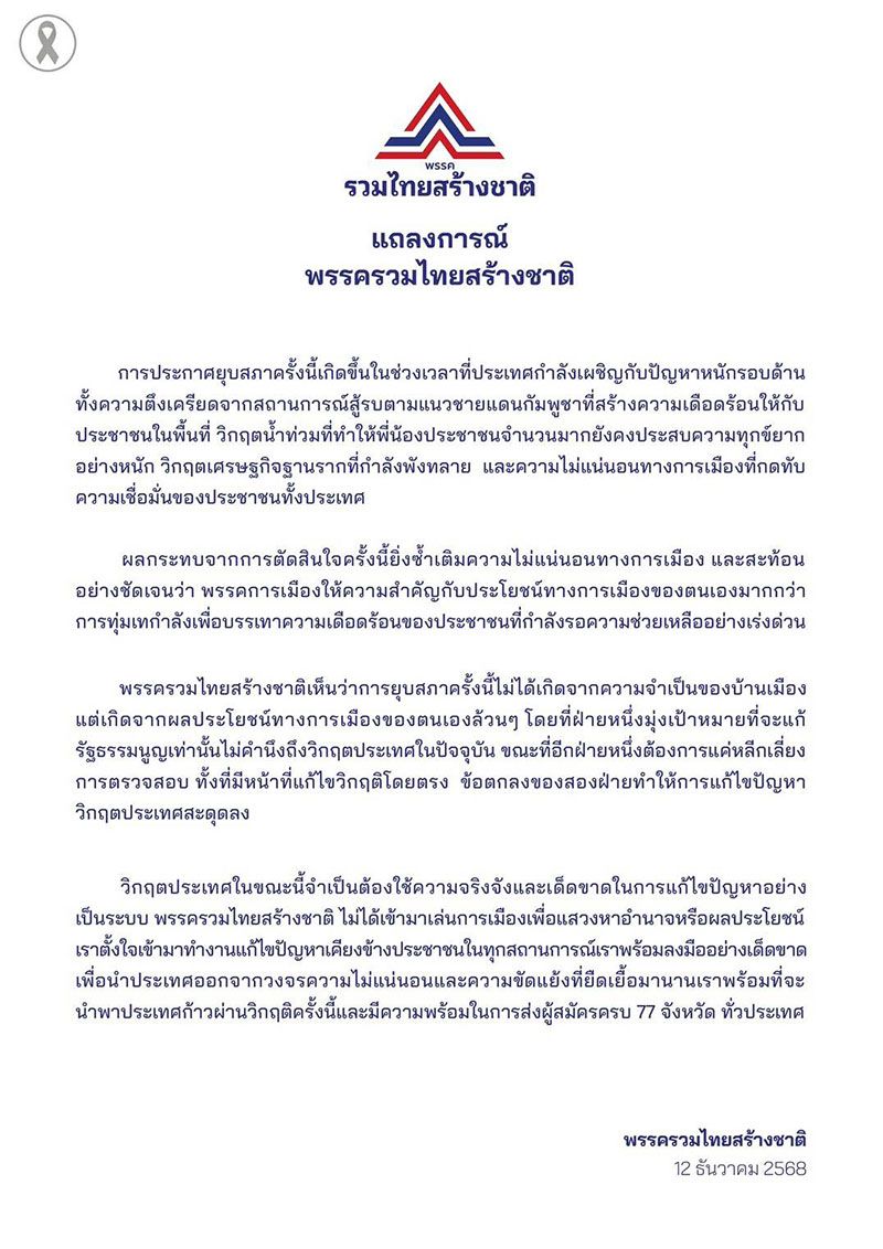 วันที่ 12 ธันวาคม 2568 พรรครวมไทยสร้างชาติ (รทสช.)ออกแถลงการณ์การประกาศยุบสภา โดยมีเนื้อหาระบุว่า ครั้งนี้เกิดขึ้นในช่วงเวลาที่ประเทศกำลังเผชิญกับปัญหาหนักรอบด้าน ทั้งความตึงเครียดจากสถานการณ์สู้รบตามแนวชายแดนกัมพูชาที่สร้างความเดือดร้อนให้กับประชาชนในพื้นที่ วิกฤตน้ำท่วมที่ทำให้พี่น้องประชาชนจำนวนมากยังคงประสบความทุกข์ยากอย่างหนัก วิกฤตเศรษฐกิจฐานรากที่กำลังพังทลาย และความไม่แน่นอนทางการเมืองที่กดทับความเชื่อมั่นของประชาชนทั้งประเทศ