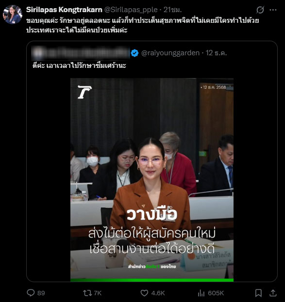 “ขอบคุณค่ะ รักษาอยู่ตลอดนะ แล้วก็ทำประเด็นสุขภาพจิตที่ไม่เคยมีใครทำไปด้วย ประเทศเราจะได้ไม่มีคนป่วยเพิ่มค่ะ”