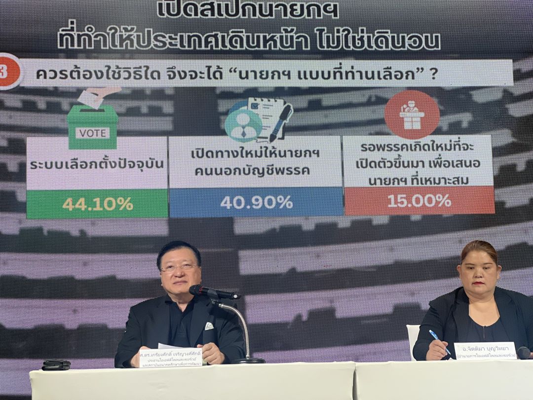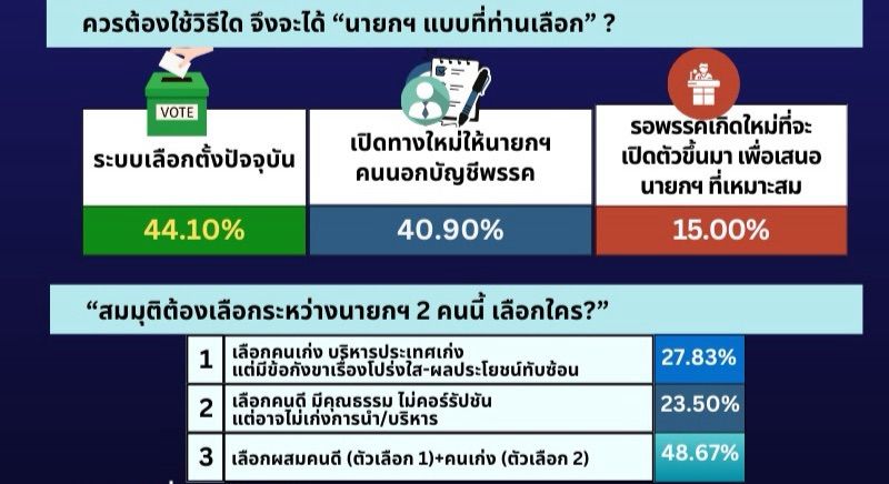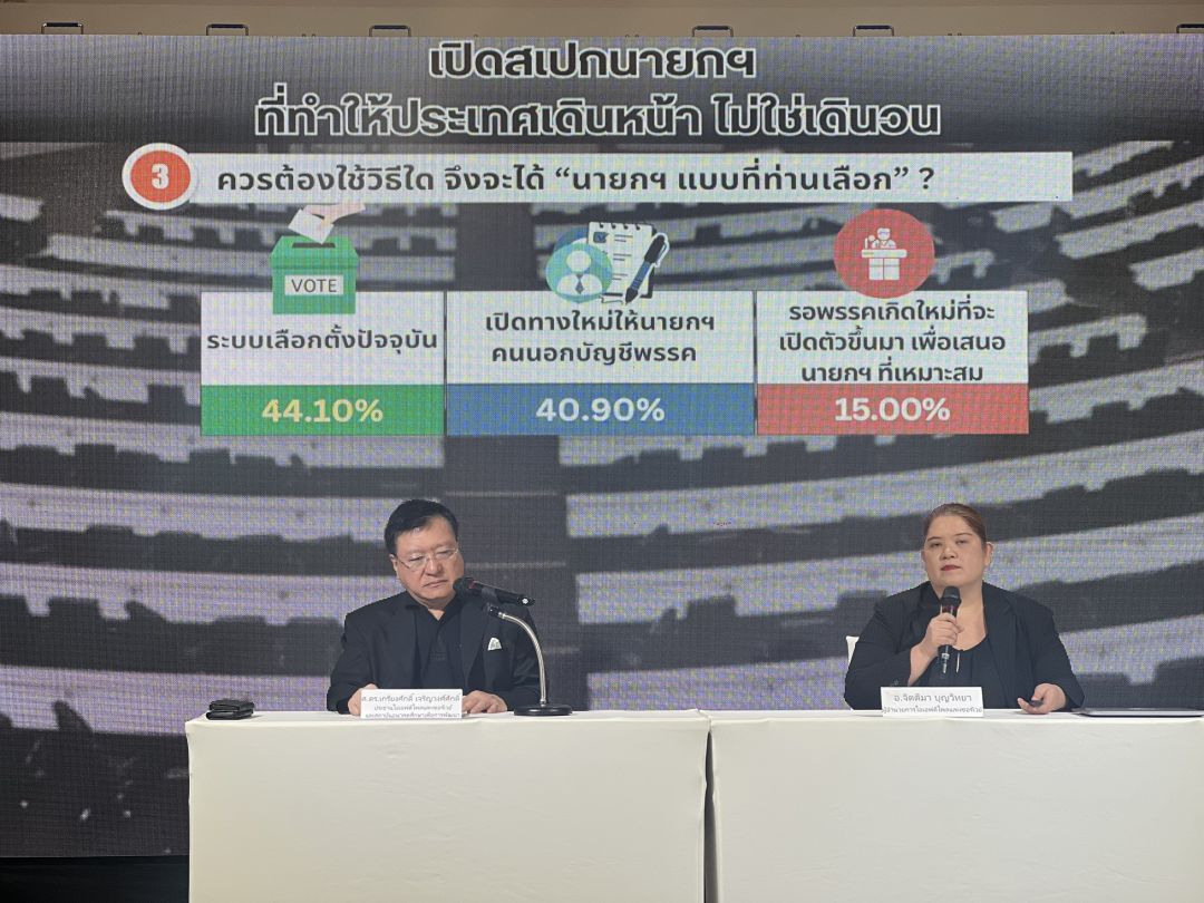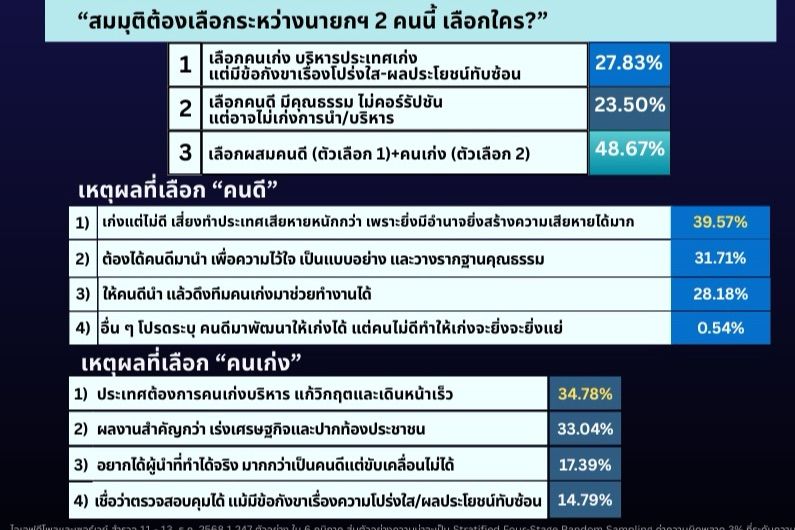 ส่วนวิธีจะได้ “นายกฯ มานำประเทศเจริญก้าวหน้า” มี 2 ทางหลัก: เลือกจากระบบเลือกตั้งปัจจุบัน และได้นายกฯ นอกบัญชีพรรคการเมือง เมื่อถามถึงเส้นทางที่จะได้ “นายกฯ แบบที่อยากได้” ประชาชนระบุว่าได้จาก “การเลือกตั้งตามระบบปัจจุบัน” 44.10% และ “เปิดทางให้นายกฯ คนนอกนอกบัญชีพรรค” 40.90% ส่วนแนวทาง “รอพรรคเกิดใหม่เพื่อเสนอนายกฯ ที่เหมาะสม” อยู่ที่ 15.00% อยากได้นายกฯ ดี หรือ เก่ง: คนส่วนใหญ่อยากได้ทั้งคนดีและคนเก่ง ประชาชนส่วนใหญ่เลือกแนวทาง “ขอทั้งดีและเก่ง” มากที่สุด โดยเลือกแบบผสม 48.67% ขณะที่เลือก “คนเก่ง” 27.83% และเลือก “คนดี” 23.50% เหตุผลของกลุ่มเลือก “คนดี” เพราะ คนเก่งแต่ไม่ดีอาจสร้างความเสียหายหนักกว่า 39.57% รองลงมาคือ ต้องได้คนดีมานำเพื่อความไว้ใจและเป็นแบบอย่าง 31.71% และมองว่าสามารถให้คนดีนำแล้วดึงทีมคนเก่งมาช่วยได้ 28.18% และเหตุผลของกลุ่มเลือก “คนเก่ง” เพราะประเทศต้องการคนเก่งบริหารเพื่อแก้วิกฤตและเดินหน้าเร็ว 34.78% รองลงมาคือผลงานสำคัญกว่า ต้องเร่งเศรษฐกิจและปากท้องประชาชน 33.04% ตามด้วยอยากได้ผู้นำที่ทำได้จริง 17.39% และเชื่อว่ามีระบบตรวจสอบคุมได้แม้มีข้อกังขา 14.79%