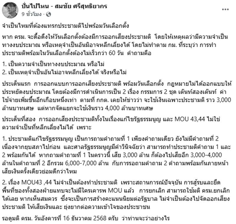 วันที่ 16 ธันวาคม 2568 สมชัย ศรีสุทธิยากร อดีตคณะกรรมการการเลือกตั้ง (กกต.) โพสต์เฟซบุ๊ก ระบุว่า จำเป็นไหมที่ต้องแทรกประชามติไปพร้อมวันเลือกตั้งหาก ครม. จะดื้อดึงให้วันเลือกตั้งต้องมีการออกเสียงประชามติ โดยให้เหตุผลว่ามีความจำเป็นทางงบประมาณ หรือเหตุจำเป็นอันมิอาจหลีกเลี่ยงได้ โดยไม่ทำตาม กม. ที่ระบุว่า การทำประชามติพร้อมในวันเลือกตั้งต้องไม่เร็วกว่า 60 วัน คำถามคือ
