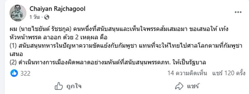วันที่ 16 ธันวาคม 2568 นายไชยันต์ รัชชกูล อาจารย์ประจำคณะรัฐศาสตร์และสังคมศาสตร์ มหาวิทยาลัยพะเยา ในฐานะผู้สนับสันุนพรรคประชาชน ได้โพสต์เฟซบุ๊ก ระบุว่า ผม (นายไชยันต์ รัชชกูล) คนหนึ่งที่สนับสนุนและเห็นใจพรรคส้มเสมอมา ขอเสนอให้ เท้ง หัวหน้าพรรค ลาออก ด้วย 2 เหตุผล คือ