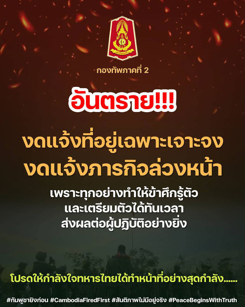 17 ธ.ค. 68 กองทัพภาคที่ 2 แจ้งรายละเอียดขอความร่วมมือว่า "อันตราย งดแจ้งที่อยู่เฉพาะเจาะจง งดแจ้งภารกิจล่วงหน้า เพราะทุกอย่างทำให้ข้าศึกรู้ตัว และเตรียมตัวได้ทันเวลา ส่งผลต่อผู้ปฏิบัติอย่างยิ่ง โปรดให้กำลังใจทหารไทยได้ทำหน้าที่อย่างสุดกำลังกำลัง"