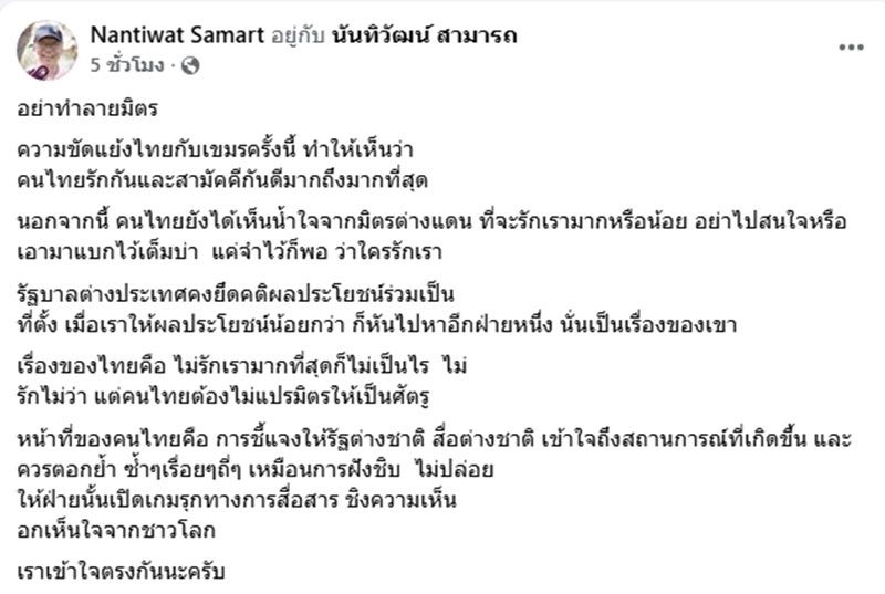 วันที่ 17 ธันวาคม 2568 นายนันทิวัฒน์ สามารถ อดีตรองผู้อำนวยการสำนักข่าวกรองแห่งชาติ โพสต์ข้อความผ่านเฟซบุ๊ก Nantiwat Samart ระบุว่า อย่าทำลายมิตร
