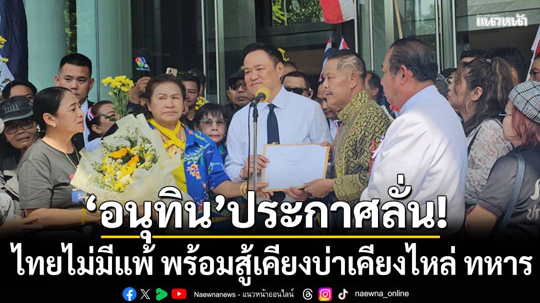 "เรามีพี่น้องประชาชนคอยเป็นกําแพงอันยิ่งใหญ่ด้านหลังของเราตลอดเวลา ฉะนั้นเราไม่มีวันที่จะหงายหลังล้ม เป็นอันขาด ในการต่อสู้ ตอบโต้และรับมือ กับผู้ที่รุกรานประเทศของเรา ผมให้ความมั่นใจ เพราะผมได้ทํางานอย่างใกล้ชิด กับฝ่ายกองทัพ และทหาร ยังไม่มีครั้งไหนเลย ที่ผู้นําทางทหารของเราจะไม่มั่นใจ ถามกี่ครั้งคําตอบก็คือไม่มีวันแพ้ เราไม่อยากจะใช้คําว่าชนะ เพราะเราไม่ได้ไปรุกรานเขา เราเป็นประเทศที่รักสงบแต่ก็ ไม่ยอมให้ใครรุกราน แต่ถามว่ากลัวไหม ไม่มีกลัว ถามว่าพร้อมไหม ทหารบอกว่าพร้อมยิ่งกว่าพร้อม และรัฐบาลสนับสนุนทหารอย่างเต็มที่"นายอนุทิน กล่าว