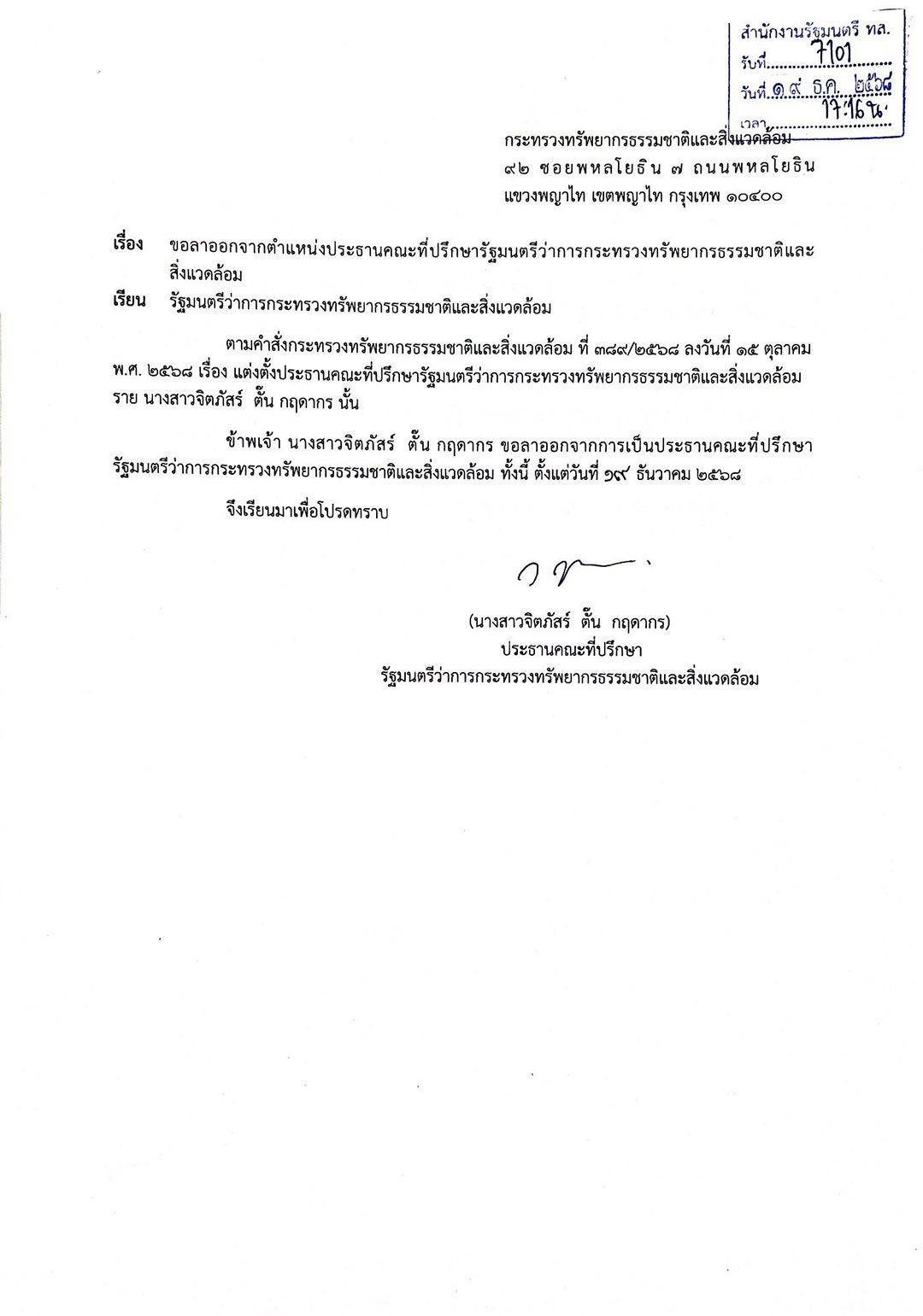 เมื่อวันที่ 19 ธันวาคม 2568 น.ส.จิตภัสร ตั๊น กฤดากร ว่าที่ผู้สมัคร สส.บัญชีรายชื่อ พรรคไทยก้าวใหม่ โพสต์เฟซบุ๊กส่วนตัว "ตั๊น จิตภัสร์ กฤดากร" แสดงหนังสือลาออกจากตำแหน่งประธานคณะที่ปรึกษารัฐมนตรีกระทรวงทรัพยากรธรรมชาติและสิ่งแวดล้อม (ทส.) พร้อมแถลงจุดยืนและบทบาทหน้าที่ มีเนื้อหาระบุว่า