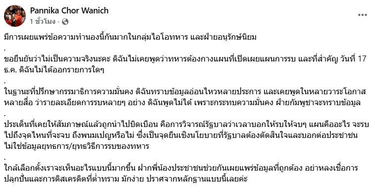 เฟซบุ๊ก Pannika Chor Wanich ของ ช่อ พรรณิการ์ วานิช ได้โพสต์ข้อความระบุว่า มีการเผยแพร่ข้อความทำนองนี้กันมากในกลุ่มไอโอทหาร และฝ่ายอนุรักษ์นิยม
