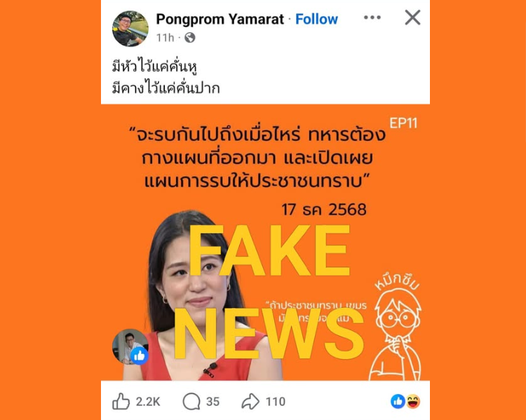 ขอยืนยันว่าไม่เป็นความจริงนะคะ ดิฉันไม่เคยพูดว่าทหารต้องกางแผนที่เปิดเผยแผนการรบ และที่สำคัญ วันที่ 17 ธ.ค. ดิฉันไม่ได้ออกรายการใดๆ